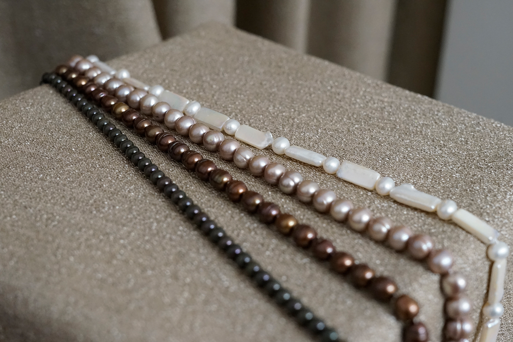 Mit der Zeit lockern sich Fäden – besonders bei häufig getragenen Ketten. Wir ziehen Perlenketten neu auf, auf Wunsch mit Knoten zwischen jeder Perle, damit die Kette beweglicher fällt und bei einem möglichen Riss nichts verloren geht. Erbstücke setzen wir neu zusammen, ergänzen fehlende Perlen passend und integrieren neue Verschlüsse.